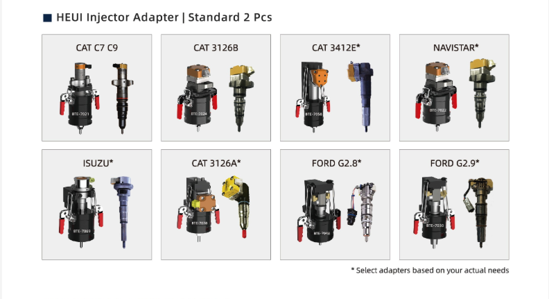 Pruebas HEUIInyectores hidráulicos (CAT C7/C9, Ford PowerStroke) con tubería oculta y sujeción rápida.